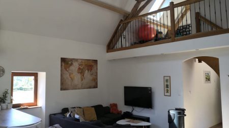 - 1 grande chambre parentale à l’étage avec un lit en 160 cm, petite salle de bain attenante avec douche, lavabo, wc