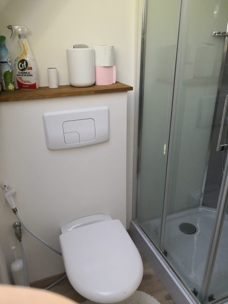• 1 grande chambre parentale à l’étage avec un lit en 160 cm, petite salle de bain attenante avec douche, lavabo, wc